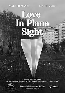 Love In Plane Sight, a 2022 silent short film,[1] directed by Matej Rimanić and shot by Nik Kranjec, stars Matej Rimanić as Boy and Eva Mlakar as Girl. It won the Grand Prix award for Best Film in the first edition of the TikTok Short Film Competition, at the 2022 Cannes Film Festival.[2][3]