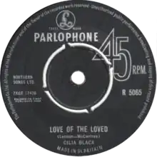 "Love of the Loved" is a song written mainly by Paul McCartney, credited to Lennon–McCartney. It is one of his earliest compositions and featured in the Beatles live act in their early days. The group recorded the song at their 1962 audition for Decca Records, but never issued it on any of their official releases. Instead, Cilla Black recorded it for her debut single, which was produced by George Martin. The single reached No. 35 on the UK Singles Chart in October 1963.[1]