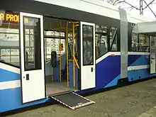 Wheelchair access ramp in Protram 205 WrAs tram. Low floor is approximately 360 mm high