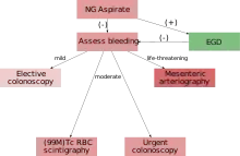 Lower gastrointestinal bleeding, commonly abbreviated LGIB, is any form of gastrointestinal bleeding in the lower gastrointestinal tract. LGIB is a common reason for seeking medical attention at a hospital's emergency department.[1] LGIB accounts for 30–40% of all gastrointestinal bleeding and is less common than upper gastrointestinal bleeding (UGIB).[2] It is estimated that UGIB accounts for 100–200 per 100,000 cases versus 20–27 per 100,000 cases for LGIB.[3] Approximately 85% of lower gastrointestinal bleeding involves the colon, 10% are from bleeds that are actually upper gastrointestinal bleeds, and 3–5% involve the small intestine.[4]