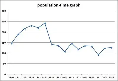The population of Lowesby Parish was 127 in 2011.[17] This level of population has not always been constant throughout the parish's history. The population of Lowesby grew by almost 100 people during the first fifty years of the 19th century.[18] By the time of the 1851 census, a UK-wide railway network had almost been completed. Coupled with minor depressions and a second phase of British industrialisation, it may have led to a decline in the local population.[19] The population has not recovered since then, with Lowesby having averaged approximately one hundred inhabitants during the 20th century.