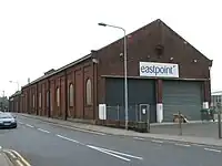 A branch from this north–south route ran westward from the Suffolk Hotel on station square along Denmark Road to the depot in Rotterdam Road, with the entrance opposite the end of Essex Road. The shed was four lanes with a glass peak to the roof. The lines were still in situ in the depot's shed and yard during the 1960s when the depot was being used for Lowestoft Corporation buses.[8] In 2009 the shed building was still being used, but not as a shelter for public transport vehicles.