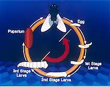The life cycle begins with the mating of the male and female species of the fly. Upon completion, the female begins oviposition and will lay the eggs on a place of interest, usually carrion. Once the eggs have been laid they will take approximately one full day to hatch, which is a short time period among flies.[1] Upon hatching, the larvae will begin the three stages of larval development consistent with this family. The first stage occurs approximately after 2 days, while the second stage occurs after 2 and a half days, and finally the third stage occurs at approximately 4 to 5 days.[1]