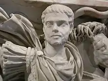 The central figure of the tortuous composition on the front is a young Roman military commander on horseback, presumed to represent the deceased. His face is serene, and his arm is extended confidently in a "gesture which is difficult to interpret but seems to be one of farewell".[8] He does not hold any weapon and is bareheaded, unlike the other Roman soldiers. This implies that he does not need any protection or weaponry to win the battle.[1] An X-mark on his forehead has been interpreted as the cross received by initiates into the Mithraic mysteries as a sign of the god Mithras' favor. The Mithraic religion was popular among Roman soldiers. The valor (virtus) shown by the horseman may represent real-life bravery on the battlefield, but the religious connotation of the X may suggest victory over death, a theme of mounted warriors in funerary art.[9] It could also have marked the figure as the "savior of humanity, the bringer of light to a world of tumult, and the guarantor of eternity."[1]