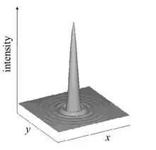Figure 6. A typical Kerr cavity soliton in the transverse plane showing a bright peak in the dark background with diffraction rings.