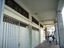 The structural system for Lui Seng Chun consists of reinforced concrete shallow pad foundations supporting granite columns with reinforced concrete beams, floors and walls.[1] Its architecture reflects the Neoclassical style which is characterised by a square-shaped frame and a row of decorative balustrades in front. The deep verandahs help prevent rain from flooding the house, block sunlight and keep the indoor area cool. This together with the stone plaque marked with the name of the medicine shop installed at the top of the building are all typical architectural features of pre-war Chinese tenements. The main facade of the building was lavishly decorated with classical Italianate designs, one of which is the "broken pediment" at the shop. The curved front elevation was designed to make better use of the narrow strip of land restricted by the road junction. In terms of structure, the external walls of the building are made of plastered red brickwork with columns and beams of reinforced concrete. Lui Seng Chun is regarded as the representative of "Kee-lau" of the pre-war period in Hong Kong.