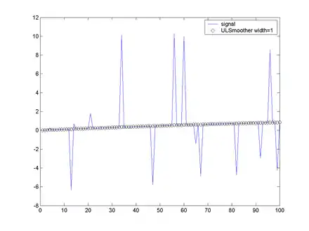 It can be seen that the results of the UL and LU operators can be different. The combined operators are very effective at removing impulsive noise, the only cases where the noise is not removed effectively is where we get multiple noise signals very close together, in which case the filter 'sees' the multiple noises as part of the signal.