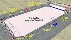 Lunacy is played on a rectangular field that is 54' by 27'. This field is a material called 'Glasliner FRP' and is referred to as 'Regolith'.[5] The regolith is designed so that the robots, which have special mandated wheels that they cannot modify in any way, shape or form, have reduced traction, mimicking the effect of low gravity that would be seen by a robot driving on the moon.