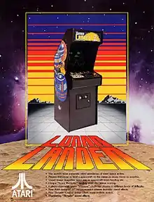 Lunar Lander proved moderately commercially successful, selling 4,830 cabinets.[5] Cash Box noted in September 1979 that the machines were very popular with customers.[13] It was Atari's first vector graphics game and the first multiple-perspective video game with the inclusion of the up-close view of the lander.[1][2] Atari developed a two-player version of the game, but only two prototypes were ever made as it did not enter production.[10] The two-player version was cancelled as Lunar Lander's popularity was soon overtaken by Atari's Asteroids (November 1979), which used the same vector graphics engine and which had initially been based on Lunar Lander's code.[10] Atari ceased production early on Lunar Lander in favor of shipping Asteroids games in Lunar Lander cabinets; the first 300 Asteroids games were released with Lunar Lander artwork on the side.[1][4][10] The Atari Lunar Lander was the most popular version to date of the "Lunar Lander" concept, surpassing the prior Moonlander and text-based games, and most later versions of the concept are implicitly or explicitly based on the Atari version.[4]