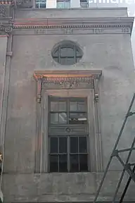 The Globe Theatre was built with an entrance on 1555 Broadway,[lower-alpha 3] between 46th and 47th Streets.[23][24] The Broadway elevation was described in the New York Dramatic Mirror as the main entrance,[15][25] though other sources stated that the Broadway entrance was secondary to that on 46th Street.[14][16] The Broadway elevation was four stories high[26] and measured 24 feet (7.3 m) wide.[27] It had been adapted from a brownstone residence and contained signs in front of it.[24] The facade was flanked by Ionic pilasters and contained interspersed stone panels.[15][16][28] The second floor was decorated with "elaborately ornamented" arched casement windows.[29] There were also masks, garlands, cherubs, pediments, and a cornice on the facade.[26] The entrance led to the box-office vestibule and a corridor to the auditorium.[7]