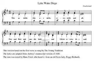 The "Lyke-Wake Dirge" is a traditional English folk song and dirge listed as number 8194 in the Roud Folk Song Index. The song tells of the soul's travel, and the hazards it faces, on its way from earth to purgatory, reminding the mourners to practise charity during lifetime. Though it is from the Christian era and features references to Christianity, much of the symbolism is thought to be of pre-Christian origin.[1][2][3][4]