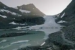 Glaciofluvial outwash is forming a prograding delta at the head of the lake and provides suspended sediment which refracts light as an intense turquoise color, giving Blåvatnet (the Blue Lake) its name.[6] Clear water in non-glacial lakes absorbs longer wavelengths of visible light and strongly reflects shorter blue and blue-green wavelengths, therefore, it appears blue due to Rayleigh scattering. The glacial flour in glacial waters provides stronger light reflection and makes the water opaque and bright. The glacial flour composition includes clay which is approximately 2-4 microns in diameter and silt which is around 4-65 microns in diameter. The composition of glacial flour absorbs most of the blue light and reflects some blue and green. With the elimination of the colors absorbed by both the glacial flour and the water itself, what is left is mostly green and some blue light reflected back off the glacial flour.[7]