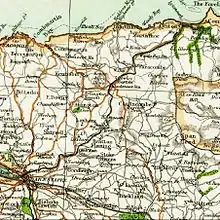 The railway has next to wind around the deep hollow in which lies Parracombe (Fox and Geese Inn) [sic], where, near the halt platform, can be seen the tower of the old church, another of those said to have been built in expiation of Thomas à Becket's murder. Hence flows the Heddon water, which one might follow down its beautiful course by the Hunter's Inn. The cyclist will find a way diverging from the main road a little beyond Parracombe. At the last station, Wooda Bay*, two miles (3 km) behind this place and its neighbour Trentishoe, the line has reached a highest point of about 1,000 feet (300 m). Beyond this, it crooks down the valley of the West Lyn (best glimpses on right hand), past Caffyn's Down Halt (for the golf links), ending some half-mile behind Lynton, and over a mile by the zig-zag road from Lynmouth.