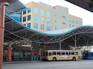 The current bus terminal at Lynx Central Station opened in 2004.[4] It is the central hub of the Lynx network, servicing nearly 30 separate bus routes.[5] The 18,000-square-foot (1,700 m2) terminal has an air-conditioned waiting area, with access to the zero-fare Lymmo bus (Orange Line) in Downtown Orlando.[6]