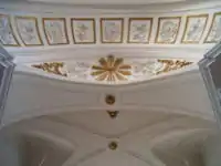 Its ceiling is decorated with arched vaults and the transition between the walls and ceiling is via a dentillated cornice around the whole church (it was extended round the choir in the 18th century). Under this cornice is a frieze whose metopes alternate between roses and doves (the latter symbolising the Holy Spirit and thus the Carthusians). On either side of the nave are four arcades opening onto side chapels, separated from each other by Doric columns.