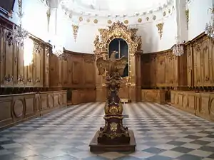 The decoration of this area contrasts slightly with the rest of the church, being more sober and thus more in keeping with the Carthusian spirit. It was finished in the 18th century.