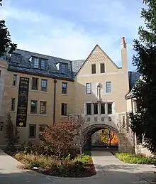 Lyons Hall is one of the 32 Residence Halls on the campus of the University of Notre Dame and one of the 14 female dorms. It is located on South Quad, and constitutes the "Golden Coast" with Morrissey Hall and Howard Hall.[2] Built in 1925-1927, it is dedicated to professor Joseph Lyons, and hosts 203 undergraduates. The coat of arms features a golden lion on a black field, representing an example of canting arms. Its arch overlooking St. Mary's lake is a campus landmark. Along with other buildings on Notre Dame's campus, it is on the National Register of Historic Places.[3][4]