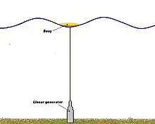The wave power concept in the Lysekil project is based on a three phase permanent magnetized linear generator placed on the seabed. The generator is connected to a point absorbing buoy at the surface via a line. When the waves move the hydrodynamic action forces the buoy to move in a heaving motion. The movements of the buoy will then drive the translator in the generator, consequently inducing current in the stator windings. The translator is connected to the generator foundation with springs that retract the translator in the wave troughs.[1][3]