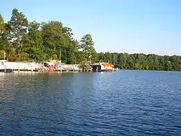 Seddinsee with the village of Schmöckwitz. In the north is the Große Krampe with Krampenburg [5] and the Berliner Stadtforst.