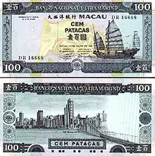 In a similar arrangement to the issue of banknotes in Hong Kong, Macau's banknotes are not issued by a central bank or monetary authority but by two commercial banks, the Banco Nacional Ultramarino and the Bank of China. Owing to Macau's Portuguese colonial past, banknotes are printed in Portuguese as well as Chinese, including the name of the Bank of China which is written as both "Banco da China" and "中國銀行".[9][10][11]