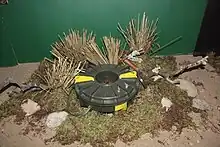 The MSM MK2 (also known as the PM-87) is a Finnish belly attack anti-tank mine. The mine has a circular ribbed plastic case that is tapered towards the bottom. It uses an electronic fuze with a combination magnetic and seismic fuze; it also has an anti-handling device. The mine is armed by inserting an arming pin, which completes an electronic circuit. The mine indicates that it is armed by lighting a small LED light which switches off after 10 minutes. When a vehicle approaches, vibrations travelling through the ground trigger the seismic sensor, which activates the magnetic sensor. When a vehicle passes over the mine, the warhead is triggered. First a clearing charge fire, removing up to 100 millimeters of earth from the top of the mine, then a copper-lined Misznay Schardin effect warhead is triggered. This projects a slug of copper at high velocity into the bottom of the target.