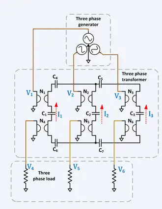 N1, N2, and N3 are the number of turns in the three primary windings. N4, N5, and N6 are the number of turns in the three secondary windings. Φ1, Φ2, and Φ3 are the fluxes in the three vertical elements. Magnetic flux in each permeance element in webers is numerically equal to the charge in the associate capacitance in coulombs. The energy in each permeance element is the same as the energy in the associated capacitor.