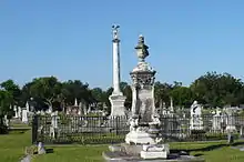 Magnolia Cemetery is a historic city cemetery located in Mobile, Alabama. Filled with many elaborate Victorian-era monuments, it spans more than 100 acres (40 ha).[3] It served as Mobile's primary, and almost exclusive, burial place during the 19th century.[3] It is the final resting place for many of Mobile's 19th- and early 20th-century citizens. The cemetery is roughly bounded by Frye Street to the north, Gayle Street to the east, and Ann Street to the west.[4] Virginia Street originally formed the southern border before the cemetery was expanded and now cuts east–west through the center of the cemetery.[4] Magnolia contains more than 80,000 burials and remains an active, though very limited, burial site today.[3][5]