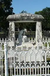The Pomeroy family mausoleum is one of two cast iron over brick mausoleums in the cemetery.[5] The Rouse monument is a Neoclassical style monument with a classically robed mourning woman placed beneath a low profiled gable supported at the four corners by columns.[5] The Confederate Rest section of the cemetery contains 1100 war dead and many large, elaborate monuments and includes an obelisk commemorating the men who died on the Confederate submarine H.L. Hunley.[5] The Jewish Cemetery contains many simple styles with Hebrew inscriptions, in addition to some of the more elaborate plots within the cemetery.[5] The Caldwell mausoleum is an example of a Gothic Revival style mausoleum. It contains a lifesize interior angel.[5] The Wilson mausoleum, by contrast, is in an example of Egyptian Revival style and features an interior wall with stained glass.[5] The LeBlanc memorial is dedicated to two sisters who died in infancy and whose grandmother commissioned the small Neo-Renaissance statuary of two putti leaning together over a stone marker. It is one of the most photographed markers in the cemetery.[5] The Bellingrath-Morse monument is a classical semicircular Doric colonnade and is one of the tallest monuments within the grounds.[5] The Mobile National Cemetery annex includes a Second Empire-style gatehouse and a brick stable built in the 1880s.[4] This annex contains over 5000 burials and a monument for the 76th Illinois Volunteer Infantry Regiment.[11] The monument was erected in 1892 by the Union Army survivors of the Battle of Fort Blakely.[11] The annex also contains the graves of thirteen Apaches who were held as prisoners nearby at Mount Vernon Arsenal between 1887 and 1894 by the Federal government.[5][11]
