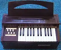 - 665: Tabletop Model, Three Octave, Six Major chord, Six Minor chord, Brown Plastic Case with faux wood - c. 1970s