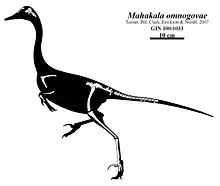Mahakala was a small dromaeosaurid, measuring 50–70 cm (20–28 in) long and weighing 400–700 g (14–25 oz).[1][2] The holotype specimen, IGM 100/1033, consists of a partial skeleton including skull bones, vertebrae, limb bones, and portions of the pelvis and shoulder girdle. Although this individual was small, comparable in size to Archaeopteryx, Caudipteryx, and Mei, it was close to adulthood. This genus can be distinguished from other paravians (dromaeosaurids, troodontids, and birds) by details of the ulna, thighbone, ilium, and tail vertebrae. Like Archaeopteryx and derived dromaeosaurids, but unlike basal troodontids and other dromaeosaurids, the middle (third) metatarsal was not compressed, suggesting that the uncompressed version was the basal version. It had a typical dromaeosaurid form of the second toe, with an expanded claw.[1]