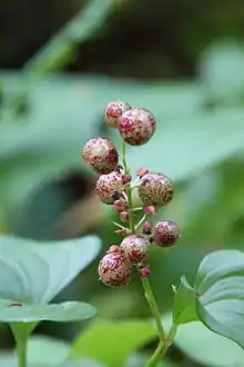 The inflorescence is an erect raceme with star-shaped white flowers. They each have four tepals and four stamens. After fertilization the fruit produced is a berry 6 millimeters in diameter. The berry is speckled red when immature and solid red when ripe. Each has 1 to 4 seeds. The leaf is green and shaped like a tear drop.