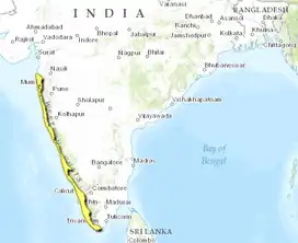 The ecoregion lies along India's Konkan and Malabar coasts, in a narrow strip between the Arabian Sea and the Western Ghats range, which runs parallel to the coast. It has an area of 35,500 square kilometers (13,700 sq mi), and extends from northern Maharashtra through Goa, Karnataka and Kerala to Kanniyakumari in southernmost Tamil Nadu.