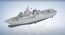 P71 is 78.4 metres long, with a beam of 13.0 metres and a maximum draft of 4.8 metres.[10] At full load, P71 will displace 2244 tons.[10] Propulsion is provided by 2 Rolls-Royce PROMAS controllable-pitch propellers, which can allow P71 to reach maximum speeds of over 20 knots (37 km/h; 23 mph).[10] P71 is powered by two Wärtsilä diesel engines with Power-take-in of 5,440 kW (7,300 hp) each.[10]