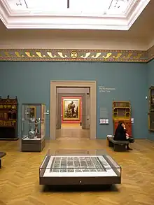 The gallery has a fine art collection consisting of more than 2,000 oil paintings, 3,000 watercolours and drawings, 250 sculptures, 90 miniatures and around 1,000 prints.[13] It owns more than 13,000 decorative art objects including ceramics, glass, enamels, furniture, metalwork, arms and armour, wallpapers, doll houses and related items.[14] The oldest object is an Egyptian canopic jar from circa 1100 BC.[14]