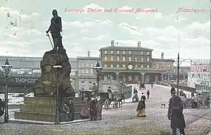 The station was built by the London and North Western Railway (LNWR) and opened on 30 June 1884.[1] The station had five platforms: 1 and 2 were bays and 3, 4 and 5 were through.[1] Platforms 4 and 5 were reached by a footbridge from near the station entrance. The opening of Exchange allowed the LNWR to vacate Manchester Victoria station to the east, which it (and its predecessors, including the Liverpool and Manchester Railway) had shared with the Lancashire and Yorkshire Railway (and its predecessors) since 4 May 1844.[2][3]