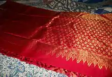 Before marriage, women used to wear a Kirgi (sari) and Baju (blouse). The Kirgi is a piece of cloth not longer than four feet, and about three feet wide. It was wrapped around the body from the waist down. A jacket with long sleeves called a Baju, was used to cover the upper part of the body. This dress was a sign of the bride's virginity and was worn during the Ros ceremony.[195][198] The Kirgi was wrapped around the waist, but the end of the sari is not thrown over the shoulder.[198] To wear the sari with its end thrown over the shoulder, known as Worl, is the exclusive right of a married woman.[199] Married women used to wear sarees the general way.[200] The Salwar kameez is another form of popular dress for females. The Mangalorean Catholic bride's wedding sari is known as a Sado.[e][201] It is usually a red-coloured Banarasi sari which is made of finely woven silk and is decorated with elaborate engravings.[193] In olden days, the bride wore on her head a red cloth, three feet square. Gold ornaments were absent in those days: the bride went to the church dressed as a virgin girl. In modern times, the bride wears (in place of the Kirgi) a red sari, but the end of the sari is not thrown over the shoulder; it is wrapped around the waist. The bride wears a few gold ornaments, some rings on the fingers, earrings, and at least two of the Dantoni (golden combs).[201] Other ornaments worn by the bride in the olden days included Kanti, Chakrasar, Kap, Karap, Mugud, Kanto, and Dantoni.[198]