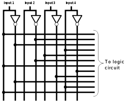 Manhattan wiring (also known as right-angle wiring) is a technique for laying out circuits in computer engineering. Inputs to a circuit (specifically, the interconnects from the inputs) are aligned into a grid, and the circuit "taps" (connects to) them perpendicularly. This may be done either virtually or physically. That is, it may be shown this way only in the documentation and the actual circuit may look nothing like that; or it may be laid out that way on the physical chip. Typically, separate lanes are used for the inverted inputs and are tapped separately.