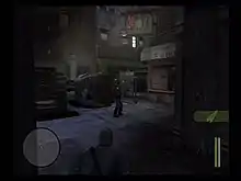 Manhunt is a stealth game played from a third-person perspective. The game consists of twenty levels, called "scenes", as well as four unlockable bonus scenes.[1] Players survive the scenes by dispatching enemy gang members, occasionally with firearms, but primarily by stealthily executing them.[3] At the end of each scene, players are graded based on their performance, and awarded one to five stars. Unlockable content becomes available when the player achieves three or more stars on a certain number of levels. On normal difficulty (called "Fetish"), players can earn only four stars; one is awarded for completing the scene under a certain amount of time, and one to three stars are awarded based on the brutality of the executions carried out during the scene. On hard difficulty (called "Hardcore"), players are graded out of five stars; one for speed, one to three for brutality and one for completing the scene. To gain the maximum number of stars, a set number of brutal executions must be carried out over the course of each scene; face-to-face fighting does not award stars.[3]
