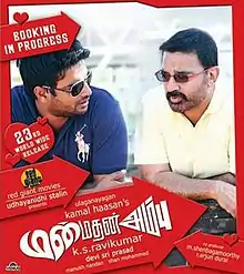 Manmadan Ambu (transl.Cupid's Arrow)[3] is a 2010 Indian Tamil-language romantic comedy film directed by K. S. Ravikumar and written by Kamal Haasan. The film stars himself, Trisha and R. Madhavan in the title roles, while featuring Sangeetha, Oviya, Ramesh Aravind, Usha Uthup, Manju Pillai and Urvashi among others in supporting roles.[4] The film features music composed by Devi Sri Prasad, with several songs written and sung by Kamal Haasan himself, while Manush Nandan and Shan Mohammed made their debuts as cinematographer and editor.