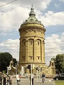 The Water Tower (German: Wasserturm) is a well-known landmark of Mannheim, Germany. The water tower was built from 1886 to 1889 on the present Frederick Square (Friedrichsplatz) by Gustav Halmhuber. The tower, which is 60 meters high and 19 meters in diameter, was Mannheim's first urban water tower. It initially had to meet with the required standards as a drinking water supply while maintaining steady water pressure. After the construction of the higher Luzenberg water tower in 1909, the Mannheim water tower served as an aboveground water tank until 2000.