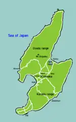 The island consists of two parallel mountain ranges running roughly southwest–northeast, enclosing a central plain. The Ōsado (大佐渡) range, in the north, is slightly higher, with peaks of Mount Kinpoku (金北山), the highest point of the island at 1,172 metres (3,845 ft), Mount Kongō, Mount Myōken, and Mount Donden. Kosado (小佐渡) range in the south faces the Honshu coast. The highest point in Kosado is Ōjiyama (大地山) at 645 m.