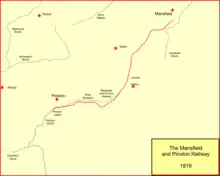 Business interests in Mansfield saw the desirability of a railway connection to the town and promoted a line from the Pinxton basin of the Cromford Canal to Mansfield. The Mansfield and Pinxton Railway was authorised by Act of 16 June 1817.[2][3] Unlike many tramway extensions to canals, it was authorised independently. Its declared purpose was to convey heavy minerals, chiefly coal, lead and limestone at first, to and from the Pinxton basin of the Cromford canal. Pinxton was at the eastern edge of coal deposits at practicable depths at the time, so the coal was to be brought into Mansfield.[1] The hilly terrain predisposed against extension of the canal. The authorised capital was £22,800. Immediately after authorisation a meeting of the proprietors took place, indicating that businesspeople had already committed to funding the construction, and no general invitation to subscribe was required.[4]