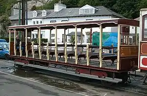 These lightweight trailers were the purchased for the opening to Groudle Glen in 1893 but only No. 49 remains in semi-regular service today. Of note also, is number 51 which was restored to original condition in 1989 including detailing of original fleet name on the end dash panels and lightweight roof. At this time the car was numbered 13 as it would originally have been; in 1893 when it arrived there were no power cars numbered past 3, and so the trailers took consecutive numbering sequence but owing to a subsequent re-think by the operators, trailers were re-numbered commencing after the last power car (33). So it was that the original number 13 was displayed until it reverted to its latter number 51 during management and policy changes in 2001. This trailer is also serviceable but the remaining class members are in storage, with 52 serving as a flatbed wagon. Traditionally this car was stripped of its seating and roofing each winter for use by permanent way crews, but this practice ceased in 1954 after which time the item has been a dedicating flatbed runner. It survives today and had a distinctive yellow-painted dash panel with standard painted fleet number, based at Laxey Car Sheds.