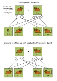The Manx taillessness gene is dominant and highly penetrant; kittens from two Manx parents are generally born without any tail. Being homozygous for (having two copies of) the gene is usually lethal in utero, resulting in miscarriage.[8][9] Thus, tailless cats can carry only one copy of the gene. Because of the danger of having two copies of the taillessness gene, breeders avoid breeding two entirely tailless Manx cats together.[43] Because neither parent carries the tailless allele, a fully tailed Manx bred to another fully tailed Manx results in all fully tailed kittens.