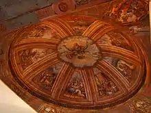 The interior exhibited a contrast of bare nave walls against the paintings drawn on the metal ceilings leading to the main altar and retablo mayor. The ceiling paintings were known to be works of Raymundo Francia, as shown by his signature on one corner of the dome in the 1930s.[14] An acknowledgment on the initiative of the San Tarcisio Martir Maribojoc Catholic Association 'Comité de Obras' could also be seen painted before the crossing.[14] Several paintings by Francia on metal had deteriorated even before the total destruction of the church by earthquake in 2013. The Francia paintings were never touched up nor repainted.[15] The new church dome (or cimborrio) was constructed in June 1889. Ray Francia was again commissioned to do mural works on the cimborrio by painting the Epistles of The Four Apostles, namely the saints John, Matthew, Luke and Mark.[16]