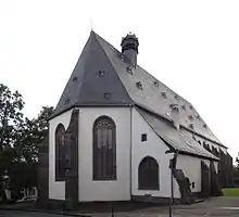 The nave is lit by two levels of windows with pointed arches in the side galleries, which are separated by a cornice. The choir has five large windows with pointed arches. In the northeastern choir window are the remains of the old stained glass windows, which include a depiction of Mary with Child in the aureole from the previous church and one of Elizabeth of Hungary from the date of the present church's original construction, flanking depictions of the coats of arms of Wais von Fauerbach (above) and of Büches (below).[22] The rest of the window paintings date to the nineteenth century. In the southern side aisle there are stained glass depictions of Martin Luther and Philip Melanchthon, as well as the risen Christ.[23] At the west end there is a pointed arch window inserted high up in the wall.[18]