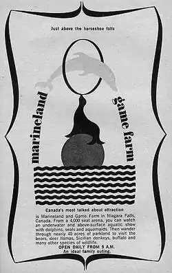 The park was founded by John Holer, a Slovenian immigrant who had worked in circuses in Europe.[4] Holer and a partner bought a portion of the Harry Oakes estate near the falls. The park opened in 1961 as "Marine Wonderland and Animal Farm".[34][35] Holer welded two large steel tanks together and brought in three sea lions and charged one quarter for admission and another to feed the animals.[34] The attraction also featured an underwater show featuring two female swimmers.[36] In 1963, a trained sea lion "Jeff" escaped from Marine Wonderland and made it to the Niagara River and went over the falls. Holer offered a CA$50 reward and organized a helicopter search.[37] The seal was recaptured by Holer a few days later in Queenston, where it was found sunning itself with teenager Tommy Haines, who was given the reward.[38] In 1964, Holer added two dolphins, along with a few other animals and the attraction became known as "Marineland And Game Farm".[36] By 1966, a 2,000-seat "aquatheatre" was completed along with a "grotto" of aquariums and shops.[36] The grotto in the new Aquarium Dome contained eight tanks used to display fresh-water fish.[39] The park became a popular family attraction and recorded an annual attendance of 250,000 for the 1967 season.[40] In 1968, the park added alligators.[39] Neighbouring attraction "Niagara Falls Indian Village" closed down after the 1968 season and Marineland purchased their property.[41]