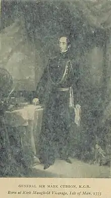 - 1 2 3 4 Harrison, Rev. S. N. (1885). Moore, A.W. (ed.). "Manx Worthies (No II): General Sir Mark Cubbon, K.C.B." The Manx Note Book. Douglas: G.H.Johnson. 1 (2): 51–54.
