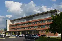 The hospital's helipad designation is (TC LID: CPH7).[4] An original heliport was located at the east end of the hospital to facilitate medical airlifts to and from the hospital. Transfer of patients requires a journey of approximately 150 ft (46 m) from the pad to the near entrance at the rear. Upon completion of the rebuilding of the hospital in 2014, the helipad is now on the roof of the new emergency wing and allows the transfer of patients directly into the hospital building. The new pad is an elevated octagon shaped pad which connects the roof of the hospital by a steel frame with a ramp to the entrance to the hospital. The relocation provides a safer landing area given that the old pad was next to public access roads around the rear of the hospital. The old pad site was removed (along with a Windsock nearby) during the re-development of the new Cornell Community Centre & Library and used as a parking/storage space by construction crews.