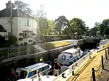 A weir at Marlow is recorded in Domesday book, and there are 14th century records of a winch to pull traffic through a flash lock. The lock was very problematical and in the 16th and 17th century there are accounts of conflicts between millers and navigators. A particular problem was the shallow draught. The first pound lock was built of fir in 1773, the seventh downstream of the eight built after the 1770 navigation act. It was upstream of the present lock and still proved problematical. Rollers were needed to guide barges in, and as there was no towpath, barges needed tow ropes several hundred feet long. The lock needed extensive repairs in 1780 and a year later eel bucks had to be removed from the flash lock in case it was needed. The first lock house was erected in 1815 and in 1825 the lock was reconstructed on its present site of Headington stone. The weir was rebuilt in 1872.[2] The last rebuilding of the lock occurred in 1927.
